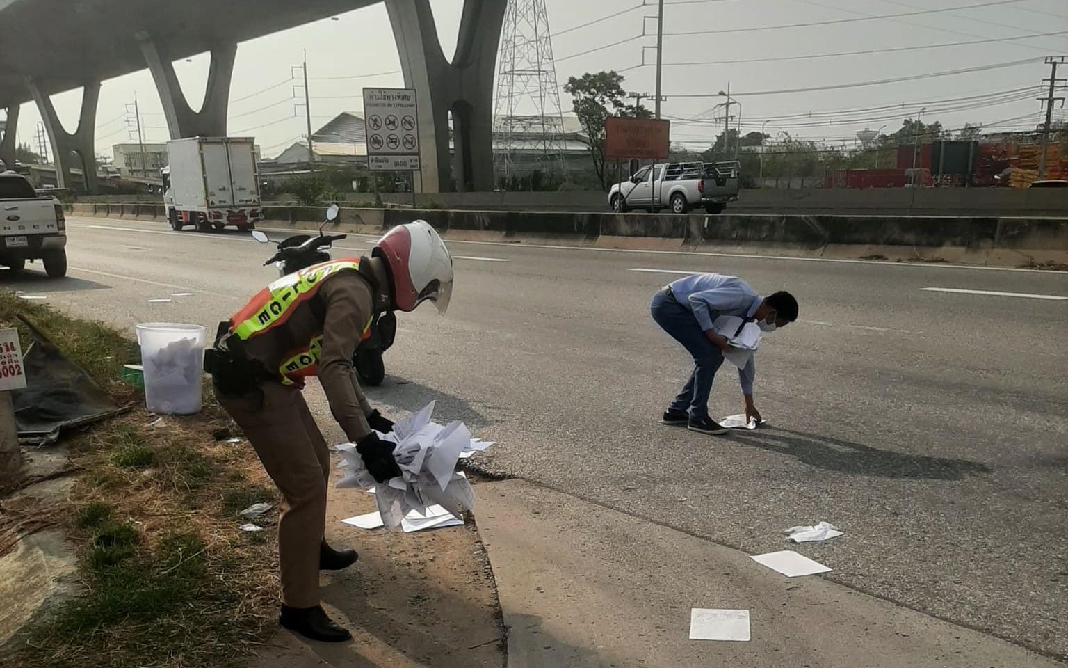 ส.ต.อ.ณฐวีร์ ปาราชิตัง ผบ.หมู่.(ป.)สภ.บางปะกง ได้รับแจ้งจากพลเมืองดีมีผู้ทำสิ่งของตกหล่นบนพื้นผิวการจราจร เกรงว่าจะเกิดอุบัติเหตุกับผู้ใช้ถนน บนถนนเทพรัตนคู่ขนานขาเข้า กทม. หน้าดูโฮม ตรวจสอบเบื้องต้นพบเป็นกระดาษจำนวนมากตกหล่นและปลิวไปทั่วถนน จึงได้เก็บเอาบางส่วนที่ยังไม่กระจายออกจากพื้นผิวถนนใส่ถังขยะเรียบร้อย