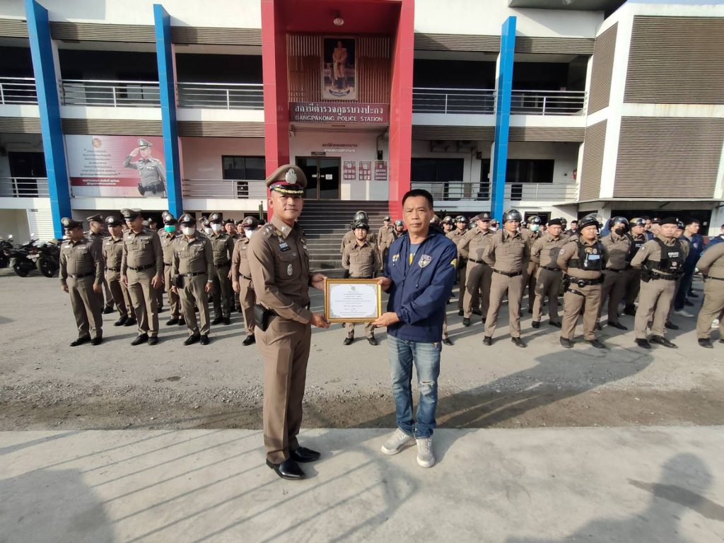 หลังจากนั้น ได้มอบใบประกาศเกียรติคุณให้กับข้าราชการตำรวจ สภ.บางปะกง เพื่อเชิดชูเกียรติในฐานะเป็นบุคคลต้นแบบในการพัฒนาบุคลิกภาพและการบริการประชาชน ณ บริเวณด้านหน้า สภ.บางปะกง